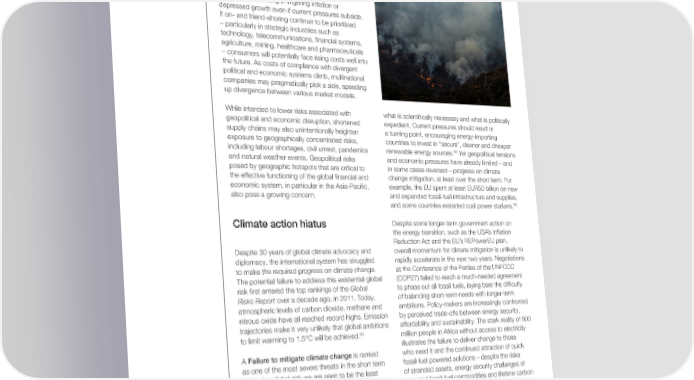 term economic diversi昀椀cation remains a signi昀椀cant distraction domestically, the current energy crisis will raise economic, military and political capital of numerous countries over the next two years. Comparative ties of the United States of America and China will have signi昀椀cant rami昀椀cations for the balance of power in the region, as well as global military dynamics, considered further in Chapter 2.4: 29 Human security. Strategies to enhance security may also come at a wider economic cost. Intensi昀椀ed geopolitical tensions risk weakening the economic landscape even further, resulting in lingering in昀氀ation or depressed growth even if current pressures subside. If on- and friend-shoring continue to be prioritized – particularly in strategic industries such as technology, telecommunications, 昀椀nancial systems, agriculture, mining, healthcare and pharmaceuticals – consumers will potentially face rising costs well into the future. As costs of compliance with divergent political and economic systems climb, multinational companies may pragmatically pick a side, speeding up divergence between various market models. While intended to lower risks associated with what is scienti昀椀cally necessary and what is politically geopolitical and economic disruption, shortened expedient. Current pressures should result in supply chains may also unintentionally heighten a turning point, encouraging energy-importing exposure to geographically concentrated risks, countries to invest in “secure”, cleaner and cheaper including labour shortages, civil unrest, pandemics renewable energy sources.32 Yet geopolitical tensions and natural weather events. Geopolitical risks and economic pressures have already limited – and posed by geographic hotspots that are critical to in some cases reversed – progress on climate the effective functioning of the global 昀椀nancial and change mitigation, at least over the short term. For economic system, in particular in the Asia-Paci昀椀c, example, the EU spent at least EUR50 billion on new also pose a growing concern. and expanded fossil-fuel infrastructure and supplies, 33 and some countries restarted coal power stations. Climate action hiatus Despite some longer-term government action on the energy transition, such as the USA’s In昀氀ation Reduction Act and the EU’s REPowerEU plan, Despite 30 years of global climate advocacy and overall momentum for climate mitigation is unlikely to diplomacy, the international system has struggled rapidly accelerate in the next two years. Negotiations to make the required progress on climate change. at the Conference of the Parties of the UNFCCC The potential failure to address this existential global (COP27) failed to reach a much-needed agreement risk 昀椀rst entered the top rankings of the Global to phase out all fossil fuels, laying bare the dif昀椀culty Risks Report over a decade ago, in 2011. Today, of balancing short-term needs with longer-term atmospheric levels of carbon dioxide, methane and ambitions. Policy-makers are increasingly confronted nitrous oxide have all reached record highs. Emission by perceived trade-offs between energy security, trajectories make it very unlikely that global ambitions affordability and sustainability. The stark reality of 600 30 to limit warming to 1.5°C will be achieved. million people in Africa without access to electricity illustrates the failure to deliver change to those A Failure to mitigate climate change is ranked who need it and the continued attraction of quick as one of the most severe threats in the short term fossil-fuel powered solutions – despite the risks but is the global risk we are seen to be the least of stranded assets, energy security challenges of prepared for, with 70% of GRPS respondents rating exported fossil fuel commodities and lifetime carbon existing measures to prevent or prepare for climate emissions that exceed the 1.5°C limit. change as “ineffective” or “highly ineffective” (Figure 4.1). According to the Intergovernmental There is also growing recognition that not only the Panel on Climate Change (IPCC), the chance of pace of the transition but also effectiveness and breaching the 1.5°C target by as early as 2030 integrity matter: climate litigation is increasing and stands at 50%. Current commitments made by the concerns about emissions under-reporting and G7 private sector suggest an increase of 2.7°C by greenwashing have triggered calls for new regulatory 34 mid-century, way above the goals outlined in the oversight for the transition to net zero. While some 31 Paris Agreement. countries have made disclosure mandatory, much of the corporate world have not yet assessed or Recent events have exposed a divergence between started to manage their climate risks. In the absence Global Risks Report 2023 21