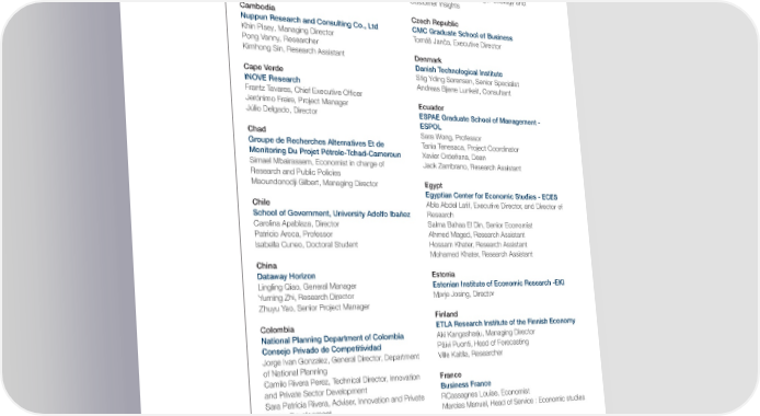 Cambodia Ramatou Fall, Director of Business Climate Nuppun Research and Consulting Co., Ltd Simon Meledje, Head of Planning and Monitoring Pisey Khin, Director Bernadine Yeble N'Guessan, Research of昀椀cer Chanthan Tha, Researcher Dalen Vyla, Research Assistant Cyprus Cyprus Employers and Industry Confederation - Cameroon OEB Compétitivité Cameroon Antonis Frangoudis, Director Business Development Hermann Fotie Ii, Permanent Secretary and Economic Affairs Department Tanankem Belmondo Voufo, Expert Investment Bank of Cyprus Climate Kyriacos Antoniou, Governance Of昀椀cer Jean Baptiste Nsoe Nkouli, Competitiveness Andreas Alexandrou, Manager Strategy and Observatory Expert Customer Insights Cambodia Czech Republic Nuppun Research and Consulting Co., Ltd CMC Graduate School of Business Khin Pisey, Managing Director Tomáš Janča, Executive Director Pong Vanny, Researcher Kimhong Sin, Research Assistant Denmark Danish Technological Institute Cape Verde Stig Yding Sørensen, Senior Specialist INOVE Research Andreas Bjerre Lunkeit, Consultant Frantz Tavares, Chief Executive Of昀椀cer Jerónimo Freire, Project Manager Ecuador Júlio Delgado, Director ESPAE Graduate School of Management - ESPOL Chad Sara Wong, Professor Groupe de Recherches Alternatives Et de Tania Tenesaca, Project Coordinator Monitoring Du Projet Pétrole-Tchad-Cameroun Xavier Ordeñana, Dean Simael Mbairassem, Economist in charge of Jack Zambrano, Research Assistant Research and Public Policies Maoundonodji Gilbert, Managing Director Egypt Egyptian Center for Economic Studies - ECES Chile Abla Abdel Latif, Executive Director, and Director of School of Government, University Adolfo Ibañez Research Carolina Apablaza, Director Salma Bahaa El Din, Senior Economist Patricio Aroca, Professor Ahmed Maged, Research Assistant Isabella Cuneo, Doctoral Student Hossam Khater, Research Assistant Mohamed Khater, Research Assistant China Dataway Horizon Estonia Lingling Qiao, General Manager Estonian Institute of Economic Research -EKI Yuming Zhi, Research Director Marje Josing, Director Zhuyu Yao, Senior Project Manager Finland Colombia ETLA Research Institute of the Finnish Economy National Planning Department of Colombia Aki Kangasharju, Managing Director Consejo Privado de Competitividad Päivi Puonti, Head of Forecasting Jorge Ivan Gonzalez, General Director, Department Ville Kaitila, Researcher of National Planning Camilo Rivera Perez, Technical Director, Innovation France and Private Sector Development Business France Sara Patricia Rivera, Adviser, Innovation and Private RCassagnes Louise, Economist Sector Development Marcias Manuel, Head of Service : Economic studies Congo, Democratic Republic of Congo-Invest Consulting Georgia Teza Bila Minlangu, Administrator TSU Center for Analysis and Forecasting Faila Tabu Ngandi, Managing Director Vakhtang Charaia, Director Bertin Muderhwa, Head of Service in charge Otar Anguridze, Head of the Board of Studies and Statistics at the Federation of Shota Gulbani, Expert Businesses of Congo Mariam Lashkhi, Project Manager Mamuka Tsereteli, Expert Côte d'Ivoire Centre de Promotion des Investissements en Côte D’ivoire - CEPICI Solange Amichia, CEO Global Risks Report 2023 91