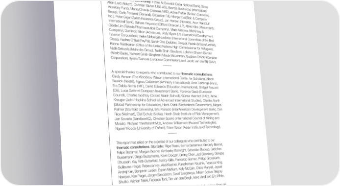 We are grateful to the following individuals from our Strategic Partners and Risk Communities. Marsh McLennan: Amy Barnes, Kate Bravery, Helga Birgden, Rico Brandenburg, Erica Davis, Missy DeAngelis, Bruno Dotti, Liz Elliot, Gunes Ergun, Guillermo Franco, Lorna Friedman, Jason Groves, Kavitha Hariharan, Ben Hoster, Rachel Juay, Marshall Lee, Paul Mee, Luca Moneta, Shilpa Pankaj, Maurizio Quintavalle, Deepakshi Rawat, Graeme Riddell, Nick Salter, Reid Sawyer, Ben Simpfendorfer, Toshin Sequeira, Swenja Surminski, Daniel Tannebaum, and Rupert Watson. Zurich Insurance Group: Paige Adams, Ines Bourbon, Laura Castellano, Matt Holmes, Stefan Kröp昀氀, Guy Miller, Pavel Osipyants, and Robert Wyse. Chief Risk Of昀椀cers Community: Fatma Al-Suwaidi (Qatar National Bank), Stacy Allen (Lord Abbott), Christian Bluhm (UBS AG), Brenda Boultwood (International Monetary Fund), Manoj Chawla (Emirates NBD), Adam Farber (Boston Consulting Group), Carlo Ferraresi (Generali), Sebastian Fritz-Morgenthal (Bain & Company Inc.), Peter Giger (Zurich Insurance Group), Jan Hansen (Novartis), Arun Hari (Gulf International Bank), Bahare Heywood (Clifford Chance LLP), Alfred Kibe (Mastercard), Giselle Lim (Takeda Pharmaceutical Company), Maria Martinez (McKinsey & Company), Domingo Mirón (Accenture), Jody Myers (US International Development Finance Corporation), Heike Niebergall-Lackner (International Committee of the Red Cross), Fiachre O'Neil (PayPal), Sarah Otte (Deloitte), Deepak Padaki (Infosys Limited), Hanne Raatikainen (Of昀椀ce of the United Nations High Commissioner for Refugees), Nidhi Seksaria (Mahindra Group), Taalib Shah (Barclays), Lakshmi Shyam-Sunder (World Bank), Richard Smith-Bingham (Marsh McLennan), Matthew Snyder (Centene Corporation), Iliyana Tsanova (European Commission), and Jacob van der Blij (GAVI). A special thanks to experts who contributed to our thematic consultations: Cindy Arnson (The Woodrow Wilson International Center for Scholars), Alison Bewick (Nestlé), Agnes Callamard (Amnesty International), Arne Cartridge (Yara), Era Dabla-Norris (IMF), David Edwards (Education International), Bridget Fawcett (Citi), Luca Gattinni (European Investment Bank), Florence Gaub (European Council), Charles Godfray (Oxford Martin School), Günter Hemrich (FAO), Anne Kreuger (John Hopkins School of Advanced International Studies), Charles North (Global Partnership for Education), Henk Ovink (Netherlands Government), Megan Palmer (Stanford University), Eric Parrado (InterAmerican Development Bank), Dan Rice (Walmart), Olaf Schulz (Nokia), Hersh Shah (Institute of Risk Management), Jen Sovada (SandboxAQ), Christian Spano (International Council of Mining and Metals), Richard Threlfall (KPMG), Andrew Williamson (Huawei Technologies), Ngaire Woods (University of Oxford), Eden Woon (Asian Institute of Technology). This report has relied on the expertise of our colleagues who contributed to our thematic consultations: Silja Baller, Filipe Beato, Emma Benameur, Kimberly Bennet, Felipe Bezamat, Morgan Booher, Kimberley Botwright, Sebastian Buckup, Gretchen Bueermann, Diego Bustamante, Kevin Doxzen, Liming Chen, Jaci Eisenberg, Genesis Elhussein, Kay Firth-Butter昀椀eld, Nancy Gillis, Fernando Gomez, Philipp Grosskurth, Guillaume Hingel, Rebecca Ivey, Ariel Kastner, Purushottam Kaushik, Rebecca King, Andrej Kirn, Benjamin Larsen, Espen Mehlum, Kelly McCain, Chido Munyati, Jayant Narayan, Kim Piaget, Jörgen Sandström, David Sangokoya, Miriam Schive, Grigory Shutko, Kristian Teleki, Federico Torti, Tim van den Bergh, Irene Varoli and Eric White. We are grateful to the following colleagues for their time and help in review: Sean de Cleene, Daniel Dobrygowski, Abdellah Hmamouche, Anis Nassar, Supheakmungkol Sarin, Tania Strauss, Alessandro Valentini, and Priya Vithani. In addition to those mentioned above, we extend our thanks to the following colleagues: Sakshi Bhatnagar, Beatrice Di Caro, Kateryna Gordiychuk, Jamie Mathew John, Gulipairi Maimaiti, Eoin Ó Cathasaigh, Robin Pomeroy, Vesselina Ratcheva, and Katja Rouru. Design and Production: Thank you to all those involved in the design and production of this year’s report: Mike Fisher (editing), Jacopo Poletto (Design), and Beatrice Lattuada (Design). Global Risks Report 2023 97