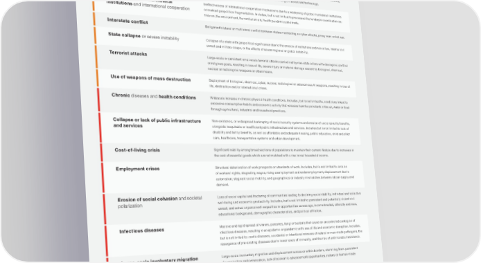 TABLE A.1 De昀椀nitions of Global Risks Global risks Description Natural resource crises Severe commodity and natural resource supply shortages at a global scale as a result of human overexploitation and/or mismanagement of critical natural resources. Includes, but is not limited to: chemicals, food, minerals and water. Geoeconomic confrontation Deployment of economic levers by global or regional powers to decouple economic interactions between nations, restricting goods, knowledge, services or technology with the intent of gaining geopolitical advantage and consolidate spheres of influence. Includes, but is not limited to: currency measures, investment controls, sanctions, state aid and subsidies, and trade controls on energy, minerals and technology. Ineffectiveness of multilateral Ineffectiveness of international cooperation mechanisms due to a weakening of global multilateral institutions institutions and international cooperation or marked geopolitical fragmentation. Includes, but is not limited to processes that underpin coordination on: finance, the environment, humanitarian aid, health pandemics and trade. Interstate conflict Belligerent bilateral or multilateral conflict between states manifesting as cyber attacks, proxy wars or hot war. State collapse or severe instability Collapse of a state with geopolitical significance due to the erosion of institutions and rule of law, internal civil unrest and military coups, or the effects of severe regional or global instability. Terrorist attacks Large-scale or persistent small-scale terrorist attacks carried out by non-state actors with ideological, political or religious goals, resulting in loss of life, severe injury or material damage caused by biological, chemical, nuclear or radiological weapons or other means. Use of weapons of mass destruction Deployment of biological, chemical, cyber, nuclear, radiological or autonomous AI weapons, resulting in loss of life, destruction and/or international crises. Chronic diseases and health conditions Widescale increase in chronic physical health conditions. Includes, but is not limited to, conditions linked to excessive consumption habits and economic activity that releases harmful pollutants in the air, water or food through agricultural, industrial and household practices. Collapse or lack of public infrastructure Non-existence, or widespread bankruptcy of social security systems and erosion of social security benefits, and services alongside inequitable or insufficient public infrastructure and services. Includes but is not limited to lack of disability and family benefits, as well as affordable and adequate housing, public education, child and elder care, healthcare, transportation systems and urban development. Cost-of-living crisis Significant inability among broad sections of populations to maintain their current lifestyle due to increases in the cost of essential goods which are not matched with a rise in real household income. Employment crises Structural deterioration of work prospects or standards of work. Includes, but is not limited to: erosion of workers' rights; stagnating wages; rising unemployment and underemployment; displacement due to automation; stagnant social mobility; and geographical or industry mismatches between labour supply and demand. Erosion of social cohesion and societal Loss of social capital and fracturing of communities leading to declining social stability, individual and collective polarization well-being and economic productivity. Includes, but is not limited to: persistent and potentially violent civil unrest; and actual or perceived inequalities in opportunities across age, income bracket, ethnicity and race, educational background, demographic characteristics, and political affiliation. Infectious diseases Massive and rapid spread of viruses, parasites, fungi or bacteria that cause an uncontrolled contagion of infectious diseases, resulting in an epidemic or pandemic with loss of life and economic disruption. Includes, but is not limited to: zootic diseases, accidental or intentional releases of natural or man-made pathogens, the resurgence of pre-existing diseases due to lower levels of immunity, and the rise of antimicrobial resistance. Large-scale involuntary migration Large-scale involuntary migration and displacement across or within borders, stemming from: persistent discrimination and persecution, lack of economic advancement opportunities, natural or human-made disasters, and internal or interstate conflict. Misinformation and disinformation Persistent false information (deliberate or otherwise) widely spread through media networks, shifting public opinion in a significant way towards distrust in facts and authority. Includes, but is not limited to, dissemination by: states, public figures, media organizations and networks of individuals. Severe mental health deterioration Widescale spread of mental health disorders or rising inequality globally across multiple demographics, which negatively impacts well being, social cohesion and productivity. Includes, but is not limited to: anxiety, dementia, depression, loneliness and stress. Risk categories Economic Environmental Geopolitical Societal Technological Global Risks Report 2023 75