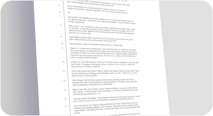 Endnotes 1. Intergovernmental Science-Policy Platform on Biodiversity and Ecosystem Services (IPBES), The global assessment report on biodiversity and ecosystem services, 2019, https://ipbes.net/sites/default/ 昀椀les/2020-02/ipbes_global_assessment_report_summary_for_policymakers_en.pdf. 2. Surminski, Swenja, Claudio Saf昀椀oti and Sumer Drall, “Embracing Nature: How Businesses Can Engage with New Environmental Imperatives”, Marsh McLennan, 27 September 2022, https://www.marshmclennan. com/content/dam/mmc-web/insights/publications/2022/september/Marsh%20McLennan%20 Embracing%20Nature_Sep27.pdf. 3. World Wildlife Foundation (WWF), Living Planet Report 2022: Building a nature-positive society, 2022, https://ww昀氀pr.awsassets.panda.org/downloads/lpr_2022_full_report.pdf; Habibullah, Muzafar Shah, Badariah Haji Din, Siow-Hooi Tan and Hasan Zahid, “Impact of climate change on biodiversity loss: global evidence”, Environmental Science and Pollution Research, vol. 9, 3 August 2021, pp. 1073-1081. 4. World Wildlife Foundation (WWF), Living Planet Report 2022: Building a nature-positive society, 2022, https://ww昀氀pr.awsassets.panda.org/downloads/lpr_2022_full_report.pdf. 5. Pörtner, Hans-Otto (Ed.), et al., Climate Change 2022: Impacts, Adaptation and Vulnerability, Intergovernmental Panel on Climate Change (IPCC), 2022, https://www.ipcc.ch/report/ar6/wg2/. 6. Ibid. 7. Over one-昀椀fth of the total buffer pool has been depleted in less than a decade. See: Badgley, Grayson, et. al, “California’s forest carbon offsets buffer pool is severely undercapitalized”, Frontiers in Forests and Global Change, 5 August 2022. 8. Gatti, Luciana V,. et al., “Amazonia as a carbon source linked to deforestation and climate change”, Nature, vol. 595, 2021, pp. 388-393; World Meteorological Organization, Greenhouse Gas Bulletin, 2022; Hook, Leslie and Chris Campbell, “Methane hunters: what explains the surge in the potent greenhouse gases?”, Financial Times, 23 August 2022. 9. World Wildlife Foundation (WWF), Living Planet Report 2022: Building a nature-positive society, 2022, https://ww昀氀pr.awsassets.panda.org/downloads/lpr_2022_full_report.pdf. 10. Kenneth Research, Vertical Farming Market Analysis 2022-2033, 31 October 2022. 11. Weidner, Till, “A holistic look at vertical farming’s carbon footprint and land use”, Agritecture, 9 May 2022. https://www.agritecture.com/blog/2022/5/9/a-holistic-look-at-vertical-farmings-carbon-footprint-and-land- use; Weidner, Till, Aidon Yang, Florian Forster and Michael W. Hamm, “Regional conditions shape the food- energy-land nexus of low-carbon indoor farming”, Nature Food, vol. 3, 2022, pp. 206-216, https://www. nature.com/articles/s43016-022-00461-7. 12. Lambin, Eric F. and Patrick Meyfroidt, “Global Land Use Change, Economic Globalization, and the Looming Land Scarcity”, Proceedings of the National Academy of Sciences 108, vol. 9, 2011, pp. 3465–3472, https://doi.org/10.1073/pnas.1100480108. 13. Tilman, David, Michael Clark, David R. Williams, Kaitlin Kimmel, Stephen Polasky and Craig Packer, “Future Threats to Biodiversity and Pathways to Their Prevention”, Nature, vol. 546, no. 7656, 2017, pp. 73–81, https://doi.org/10.1038/nature22900. 14. White, Natasha, “Debt-for-Nature swaps gain traction among developing countries”, Bloomberg, 7 November 2022, https://www.bloomberg.com/news/articles/2022-11-07/debt-for-nature-swaps-offer- option-for-developing-countries?leadSource=uverify%20wall. 15. Baldwin, Clare, Marc Jones and Simon Jesspo, “Bankers bet billions on new wave of debt-for-nature deals”, Reuters, 17 November 2022, https://www.reuters.com/business/cop/bankers-bet-billions-new- wave-debt-for-nature-deals-2022-11-17/. 16. Karlsruher Institut für Technologie. “Trade-off between biodiversity and food security in land use”, Science Daily, 18 February 2022, https://www.sciencedaily.com/releases/2022/02/220218100712.htm. 17. Tzay, José Francisco Calí, “Indigenous Peoples Still Suffer from Poverty, Climate Change and Loss of Ancestral Lands, Delegates Highlight in Third Committee”, United Nations General Assembly Seventy- Seventh Session, 16th Meeting, New York, 12 October 2022, https://press.un.org/en/2022/gashc4350. doc.htm. 18. FAO Commission on Genetic Resources for Food and Agriculture, Biodiversity for Food and Agriculture, 2019, https://www.fao.org/state-of-biodiversity-for-food-agriculture/en/,. 19. Gasparatos, Alexandros, et al., “Renewable energy and biodiversity: Implications for transitioning to a Green Economy”, Renewable and Sustainable Energy Reviews, vol. 70, 2017, pp 161-184, https://www. sciencedirect.com/science/article/pii/S1364032116304622#s0060. 20. Kang, Dake, Victoria Milko and Lori Hinnant, “'The Sacri昀椀ce Zone': Myanmar bears cost of green energy”, AP News, 9 August 2022, https://apnews.com/article/technology-forests-myanmar-75df22e8d7431a675 7ea4a426fbde94c; UN Environment Programme (UNDEP), Can the Democratic Republic of the Congo’s mineral resources provide a pathway to peace?, 20 September 2022; Global Witness, Myanmar’s poisoned mountains, 9 August 2022, https://www.globalwitness.org/en/campaigns/natural-resource-governance/ myanmars-poisoned-mountains/. Global Risks Report 2023 50
