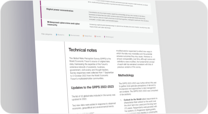 TABLE A.1 De昀椀nitions of Global Risks Global risks Description Adverse outcomes of frontier Intended or unintended negative consequences of technological advances on individuals, businesses, technologies ecosystems and/or economies. Includes, but is not limited to: AI, brain-computer interfaces, biotechnology, geo-engineering, quantum computing and the metaverse. Breakdown of critical information Deterioration, overload or shutdown of critical physical and digital infrastructure or services leading to infrastructure the breakdown of internet, cellular devices, public utilities or satellites. Stemming from, but not limited to, cyberattacks, intentional or unintentional physical damage, or solar storms. Digital inequality and lack of access to Fractured or unequal access to digital networks and technologies stemming from underinvestment, low digital digital services skills, insufficient purchasing power, or government restrictions on technologies. Digital power concentration Concentration of critical digital assets, capabilities or knowledge among a small number of individuals, businesses or states that can control access to digital technologies and demand discretionary pricing. Stemming from, but not limited to, the failure of anti-trust regulation, inadequate investment in the innovation ecosystem, or state control over key technologies. Widespread cybercrime and cyber Increasingly sophisticated cyberespionage or cybercrimes. Includes, but is not limited to: loss of privacy, data insecurity fraud or theft, and cyber espionage. Risk categories Economic Environmental Geopolitical Societal Technological Technical notes modi昀椀ed and/or expanded to re昀氀ect new ways in which the risks may materialize and the potential adverse outcomes they may cause. However, to The Global Risks Perception Survey (GRPS) is the ensure comparability over time, although names and World Economic Forum’s source of original risks de昀椀nitions were modi昀椀ed, the fundamental concept data, harnessing the expertise of the Forum’s of each risk has remained consistent with that of extensive network of academic, business, previous versions of the survey. government, civil society and thought leaders. Survey responses were collected from 7 September to 5 October 2022 from the World Economic Methodology Forum’s multistakeholder communities. The GRPS 2022–2023 was further re昀椀ned this year Updates to the GRPS 2022-2023 to gather more granular perceptions of risk and to incorporate new approaches to risk management and analysis. The GRPS 2022–2023 was comprised The list of 32 global risks included in the survey was of six sections: updated in 2022. 1. Outlook for the World asked respondents to Two new risks were added in response to observed characterize their outlook for the world over economic, geopolitical and environmental trends: the short term (two years) and the long term (10 years). Respondents were provided with 1. “Cost-of-living crisis” 昀椀ve options: (1) Progressive tipping points and persistent crises leading to catastrophic 2. “Misinformation and disinformation” outcomes, (2) Consistently volatile across economies and industries with multiple shocks In addition, “Climate action failure” was delineated accentuating divergent trajectories, (3) Slightly into two separate risks: volatile with occasional localized surprises, (4) Limited volatility with relative stability, and 1. “Failure of climate-change adaption” (5) Renewed stability with a revival of global resilience. A simple tally for each of the 昀椀ve 2. “Failure to mitigate climate change” options was calculated. The result is illustrated in Figure 1.10. The names and de昀椀nitions of the remaining risks have been revised and, where applicable, merged, 2. Currently Manifesting Risks asked Global Risks Report 2023 76
