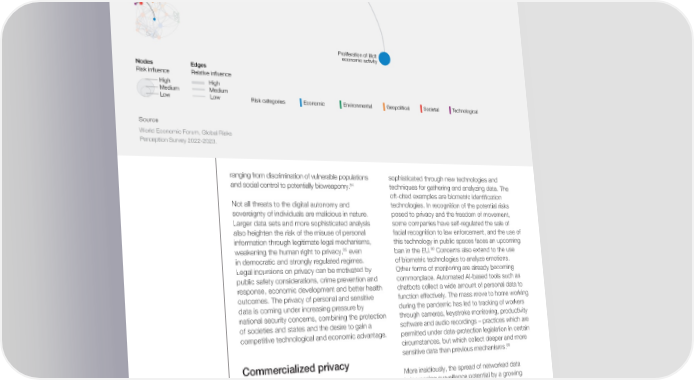 FIGURE 2.9 Risk interconnections: cyber insecurity Adverse outcomes Widespread cybercrime of frontier technologies and cyber insecurity Digital power concentration Interstate conflict Digital inequality Terrorist attacks Misinformation and Breakdown of critical disinformation information infrastructure Reference Proliferation of illicit economic activity Nodes EdgesEdges Risk influence Relative influence High High Medium Medium Low Low Risk categories Economic Environmental Geopolitical Societal Technological Source World Economic Forum, Global Risks Perception Survey 2022-2023. ranging from discrimination of vulnerable populations sophisticated through new technologies and 84 and social control to potentially bioweaponry. techniques for gathering and analyzing data. The oft-cited examples are biometric identi昀椀cation Not all threats to the digital autonomy and technologies. In recognition of the potential risks sovereignty of individuals are malicious in nature. posed to privacy and the freedom of movement, Larger data sets and more sophisticated analysis some companies have self-regulated the sale of also heighten the risk of the misuse of personal facial recognition to law enforcement, and the use of information through legitimate legal mechanisms, this technology in public spaces faces an upcoming 85 88 weakening the human right to privacy, even ban in the EU. Concerns also extend to the use in democratic and strongly regulated regimes. of biometric technologies to analyze emotions. Legal incursions on privacy can be motivated by Other forms of monitoring are already becoming public safety considerations, crime prevention and commonplace. Automated AI-based tools such as response, economic development and better health chatbots collect a wide amount of personal data to outcomes. The privacy of personal and sensitive function effectively. The mass move to home working data is coming under increasing pressure by during the pandemic has led to tracking of workers national security concerns, combining the protection through cameras, keystroke monitoring, productivity of societies and states and the desire to gain a software and audio recordings – practices which are competitive technological and economic advantage. permitted under data-protection legislation in certain circumstances, but which collect deeper and more 89 sensitive data than previous mechanisms. Commercialized privacy More insidiously, the spread of networked data is increasing surveillance potential by a growing The right to privacy as it applies to information about number of both public- and private-sector actors, 90 individuals incorporates two key elements: the right despite stringent regulatory protection. As our not to be observed and the right to control the 昀氀ow lives become increasingly digitalized over the 86 of information when observed. As more data is next decade, our “everyday experience” will be collected and the power of emerging technologies recorded and commodi昀椀ed through internet-enabled increases over the next decade, individuals will be devices, more intelligent infrastructure and “smart” targeted and monitored by the public and private cities – a passive, pervasive and persistent form of sector to an unprecedented degree, often without networked observations that are already being used 87 91 adequate anonymity or consent. to create targeted pro昀椀les. This pattern will only be enhanced by the metaverse, which could collect Surveillance technologies are becoming increasingly and track even more sensitive data, including facial Global Risks Report 2023 43