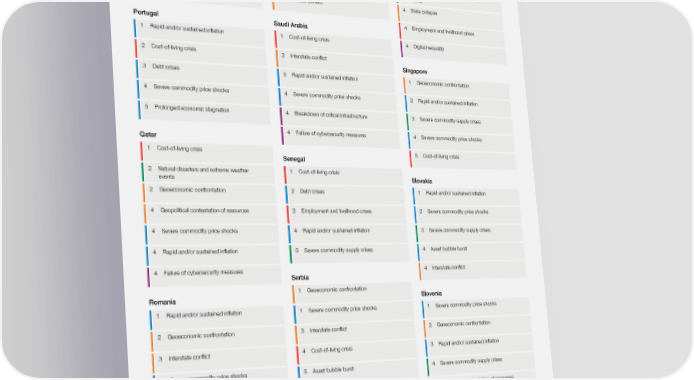 TABLE B.2 Top five risks identified by the Executive Opinion Survey (EOS) Poland Rwanda Sierra Leone 1 Rapid and/or sustained inflation 1 Rapid and/or sustained inflation 1 Cost-of-living crisis 2 Breakdown of critical infrastructure 1 Cost-of-living crisis 2 Rapid and/or sustained inflation 3 Geoeconomic confrontation 3 Severe commodity price shocks 3 Debt crises 4 Employment and livelihood crises 4 Natural disasters and extreme weather 4 Natural disasters and extreme weather events events 5 Interstate conflict 5 Interstate conflict 4 State collapse 4 Employment and livelihood crises Portugal Saudi Arabia 1 Rapid and/or sustained inflation 1 Cost-of-living crisis 4 Digital inequality 2 Cost-of-living crisis 2 Interstate conflict Singapore 3 Debt crises 3 Rapid and/or sustained inflation 1 Geoeconomic confrontation 4 Severe commodity price shocks 4 Severe commodity price shocks 2 Rapid and/or sustained inflation 5 Prolonged economic stagnation 4 Breakdown of critical infrastructure 3 Severe commodity supply crises 4 Failure of cybersecurity measures 4 Severe commodity price shocks Qatar 1 Cost-of-living crisis 5 Cost-of-living crisis Senegal 2 Natural disasters and extreme weather 1 Cost-of-living crisis events Slovakia 2 Geoeconomic confrontation 2 Debt crises 1 Rapid and/or sustained inflation 4 Geopolitical contestation of resources 2 Employment and livelihood crises 2 Severe commodity price shocks 4 Severe commodity price shocks 4 Rapid and/or sustained inflation 3 Severe commodity supply crises 4 Rapid and/or sustained inflation 5 Severe commodity supply crises 4 Asset bubble burst 4 Failure of cybersecurity measures 4 Interstate conflict Serbia 1 Geoeconomic confrontation Romania Slovenia 1 Rapid and/or sustained inflation 1 Severe commodity price shocks 1 Severe commodity price shocks 2 Geoeconomic confrontation 3 Interstate conflict 2 Geoeconomic confrontation 3 Interstate conflict 4 Cost-of-living crisis 3 Rapid and/or sustained inflation 4 Severe commodity price shocks 5 Asset bubble burst 4 Severe commodity supply crises 4 Cost-of-living crisis 5 Severe commodity supply crises 5 Geopolitical contestation of resources Risk categories Economic Environmental Geopolitical Societal Technological Global Risks Report 2023 87