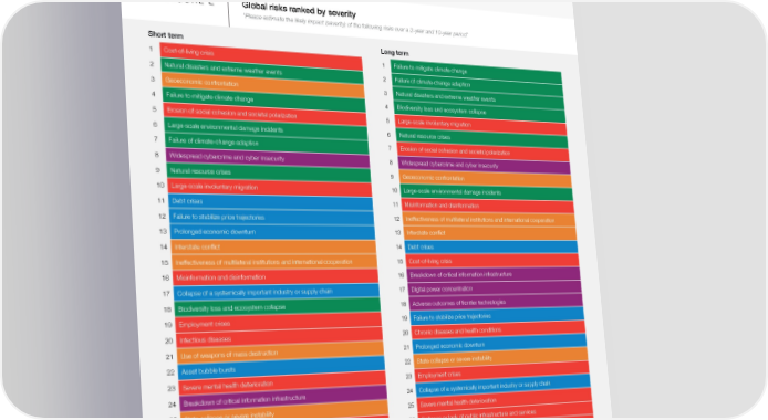 FIGURE D Currently manifesting risks “Please rank the top 5 currently manifesting risks in order of how severe you believe their impact will be on a global level in 2023” 1 2 3 4 5 Energy supply crisis Cost-of-living crisis Rising inflation Food supply crisis Cyberattacks on critical infrastructure Source Risk categories Economic Environmental Geopolitical Societal Technological World Economic Forum Global Risks Perception Survey 2022-2023. FIGURE E Global risks ranked by severity "Please estimate the likely impact (severity) of the following risks over a 2-year and 10-year period" Short term Long term 1 Cost-of-living crisis 1 Failure to mitigate climate change 2 Natural disasters and extreme weather events 2 Failure of climate-change adaption 3 Geoeconomic confrontation 3 Natural disasters and extreme weather events 4 Failure to mitigate climate change 4 Biodiversity loss and ecosystem collapse 5 Erosion of social cohesion and societal polarization 5 Large-scale involuntary migration 6 Large-scale environmental damage incidents 6 Natural resource crises 7 Failure of climate-change adaption 7 Erosion of social cohesion and societal polarization 8 Widespread cybercrime and cyber insecurity 8 Widespread cybercrime and cyber insecurity 9 Natural resource crises 9 Geoeconomic confrontation 10 Large-scale involuntary migration 10 Large-scale environmental damage incidents 11 Debt crises 11 Misinformation and disinformation 12 Failure to stabilize price trajectories 12 Ineffectiveness of multilateral institutions and international cooperation 13 Prolonged economic downturn 13 Interstate conflict 14 Interstate conflict 14 Debt crises 15 Ineffectiveness of multilateral institutions and international cooperation 15 Cost-of-living crisis 16 Misinformation and disinformation 16 Breakdown of critical information infrastructure 17 Collapse of a systemically important industry or supply chain 17 Digital power concentration 18 Biodiversity loss and ecosystem collapse 18 Adverse outcomes of frontier technologies 19 Employment crises 19 Failure to stabilize price trajectories 20 Infectious diseases 20 Chronic diseases and health conditions 21 Use of weapons of mass destruction 21 Prolonged economic downturn 22 Asset bubble bursts 22 State collapse or severe instability 23 Severe mental health deterioration 23 Employment crises 24 Breakdown of critical information infrastructure 24 Collapse of a systemically important industry or supply chain 25 State collapse or severe instability 25 Severe mental health deterioration 26 Chronic diseases and health conditions 26 Collapse or lack of public infrastructure and services 27 Collapse or lack of public infrastructure and services 27 Infectious diseases 28 Proliferation of illicit economic activity 28 Use of weapons of mass destruction 29 Digital power concentration 29 Proliferation of illicit economic activity 30 Terrorist attacks 30 Digital inequality and lack of access to digital services 31 Digital inequality and lack of access to digital services 31 Asset bubble bursts 32 Adverse outcomes of frontier technologies 32 Terrorist attacks Source Risk categories Economic Environmental Geopolitical Societal Technological World Economic Forum Global Risks Perception Survey 2022-2023. Global Risks Report 2023 11