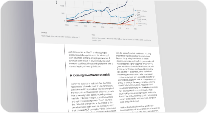 FIGURE 2.10 The composition of public debt B. General government debt 300B 250B Multilateral 200B 150B US$ (billions) Bilateral, excluding 100B China China Private creditors, 50B bonds Private creditors, banks Private creditors, 0 others 1980 1985 1990 1995 2000 2005 2010 2015 2020 Source Note World Bank, International Debt Statistics database.134 General Government Debt for 68 of the 72 Debt Service Suspension Initiative (DSSI) countries by creditor type. 135 and state-owned entities, to raise aggregate from the areas of greatest social need, including exposure and place pressure on the solvency of expenditure in public goods and infrastructure. even advanced and large emerging economies. A Beyond the growing 昀椀nancial cost of natural sovereign debt default in a systemically important disasters, emerging and developing economies will economy could result in systemic proliferation with a need to spend a higher proportion of GDP on the devastating impact on a global scale. green transition and sustainable infrastructure, with knock-on rami昀椀cations for other public spending 137 and services. By contrast, within the limits of A looming investment shortfall in昀氀ationary pressures, advanced economies can continue to leverage more accessible 昀椀nancing for economic development, such as stronger industrial Even in the absence of a global crisis, the 1980s policy, to underpin the energy transition, widening “lost decade” of development in Latin America and the divide between countries. Necessary 昀椀scal Sub-Saharan Africa provides a very real example of consolidation in emerging and developing economies the economic and humanitarian crisis that can arise may also rely heavily on spending cuts, which from a sovereign debt default, including currency could rapidly remove social protection available to free falls, collapses in output, cost-of-living crises low-income and vulnerable populations, increasing and rapid increases in poverty. The 41 countries poverty and inequality within countries, alongside that defaulted on their debt in the 昀椀rst half of the social and political unrest. decade required eight years, on average, to reach 136 their pre-crisis GDP per capita. Debt distress and Yet in a structurally different low-growth, low- restructuring will also have an impact on investment. investment economic era, even advanced economies According to GRPS results, the risk of Debt crises will need to make trade-offs. Rising unemployment, drops in perceived severity over the longer-term social unrest and political polarization, and even time frame, but the Collapse or lack of public technologically-driven churn in both blue- and white- infrastructure and services becomes more severe. collar jobs may in昀氀uence the prioritization of current The ability to 昀椀nance continued productivity and expenditure over longer-term capital expenditure, resilience will be hampered by economic and political while security considerations may mean there is dynamics on both a global and national level. less 昀椀scal headroom for social and environmental development over the medium term. The potential Advanced economies will have more autonomy result is the de-prioritization of investment and slow to invest in future priorities, while developing decay of public infrastructure and services in both 138 markets may be more beholden to the demands developing and advanced markets. Around two- of the creditor, meaning money could be diverted 昀椀fths of low- and lower-middle-income countries Global Risks Report 2023 48