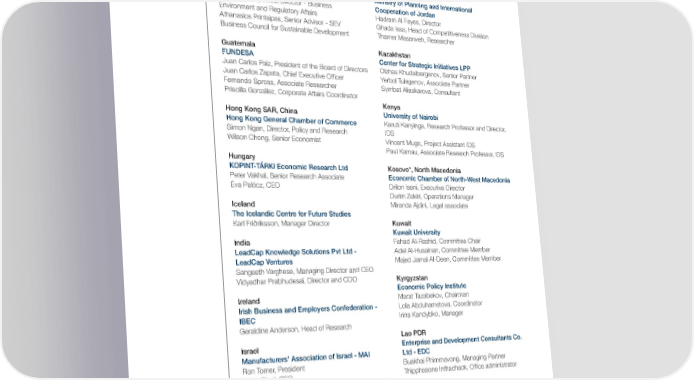 Germany Shulette Cox, Vice President, Research, Advocacy, Institute for Innovation and Technology within the and Project Implementation VDI/VDE Innovation + Technik GmbH National Competitiveness Council Jamaica Michael Nerger, Project Leader Sharifa Powell, Consultant Project Manager Ghana Japan Association of Ghana Industries Waseda University Yaw Adu-Gyam昀椀, President Jusuke Ikegami, Professor Seth Twum-Akwaboah, Chief Executive Of昀椀cer Mitsuyo Tsubayama, Coordinator John Defor, Direcctor, Policy and Research Shoko Miya, Coordinator Greece Jordan SEV Hellenic Federation of Enterprises Ministry of Planning and International Michael Mitsopoulos, Director - Business Cooperation of Jordan Environment and Regulatory Affairs Hadram Al Fayes, Director Athanasios Printsipas, Senior Advisor - SEV Ghada Issa, Head of Competitiveness Division Business Council for Sustainable Development Thamer Masarweh, Researcher Guatemala Kazakhstan FUNDESA Center for Strategic Initiatives LPP Juan Carlos Paiz, President of the Board of Directors Olzhas Khudaibergenov, Senior Partner Juan Carlos Zapata, Chief Executive Of昀椀cer Yerbol Tulegenov, Associate Partner Fernando Spross, Associate Researcher Symbat Aliaskarova, Consultant Priscilla González, Corporate Affairs Coordinator Kenya Hong Kong SAR, China University of Nairobi Hong Kong General Chamber of Commerce Karuti Kanyinga, Research Professor and Director, Simon Ngan, Director, Policy and Research IDS Wilson Chong, Senior Economist Vincent Mugo, Project Assistant IDS Paul Kamau, Associate Research Professor, IDS Hungary KOPINT-TÁRKI Economic Research Ltd Kosovo*, North Macedonia Peter Vakhal, Senior Research Associate Economic Chamber of North-West Macedonia Éva Palócz, CEO Drilon Iseni, Executive Director Durim Zekiri, Operations Manager Iceland Miranda Ajdini, Legal associate The Icelandic Centre for Future Studies Karl Friðriksson, Manager Director Kuwait Kuwait University India Fahad Al-Rashid, Committee Chair LeadCap Knowledge Solutions Pvt Ltd - Adel Al-Husainan, Committee Member LeadCap Ventures Majed Jamal Al-Deen, Committee Member Sangeeth Varghese, Managing Director and CEO Vidyadhar Prabhudesai, Director and COO Kyrgyzstan Economic Policy Institute Ireland Marat Tazabekov, Chairman Irish Business and Employers Confederation - Lola Abduhametova, Coordinator IBEC Irina Kandybko, Manager Geraldine Anderson, Head of Research Lao PDR Israel Enterprise and Development Consultants Co. Manufacturers' Association of Israel - MAI Ltd - EDC Ron Tomer, President Buakhai Phimmavong, Managing Partner Ruby Ginel, CEO Thipphasone Inthachack, Of昀椀ce administrator Dan Catarivas, General Manager, Foreign Trade and International Relations Division Latvia Itai Nakash, Deputy General Manager, Foreign Trade Stockholm School of Economics in Riga and International Relations Division Arnis Sauka, Head of the Centre for Sustainable Development Jamaica Mona School of Business and Management - Lesotho MSBM, The University of the West Indies, Mona Private Sector Foundation of Lesotho - PSFL David McBean, Executive Director Thabo Qhesi, CEO Franklin Johnston, Director Bokang Tsoanamatsie, Public Relations Of昀椀cer Yvette Cameron-Harris, Project Administrator Qothoase Khofane, Researcher Jamaica Promotions Corporation - JAMPRO Global Risks Report 2023 92