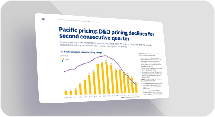 16 Global insurance markets: Financial and professional lines pricing declines Paci昀椀c pricing: D&O pricing declines for second consecutive quarter Insurance pricing in the Paci昀椀c region increased 5%, down from 7% in the prior quarter and the seventh consecutive quarterly reduction in rate increases (see Figures 12 and 13). 12| Paci昀椀c composite insurance pricing change Property insurance pricing increased 4%, down from 5% in the prior quarter. Paci昀椀c • Severe 昀氀ood events in Queensland and Global New South Wales earlier in the year — with 22% an estimated insured loss greater than 19% 20% $AUD6 billion — has increased the focus 18% on storm/昀氀ood risk mitigation, deductible adequacy, and sub-limits. 15% 15% • Underwriters continued to focus on general 14% 13% CAT and secondary CAT perils. 11% 11% • Commitment to continual risk improvement is critical to renewal success. Insurers also focused on current valuations supporting 9% declared values. 8% Casualty insurance pricing rose 10%, down 6% 6% from 11% in the prior quarter. 5% • Insurers demonstrated continued caution due to claims in昀氀ation resulting from 3% 2% 2% litigation trends, as well as in昀氀ation in material cost. • Some major programs underwent substantial restructuring of layers as a Q3 18 Q4 18 Q1 19 Q2 19 Q3 19 Q4 19 Q1 20 Q2 20 Q3 20 Q4 20 Q1 21 Q2 21 Q3 21 Q4 21 Q1 22 Q2 22 Q3 22 result of changing underwriter appetite. Source: Marsh Specialty and Global Placement