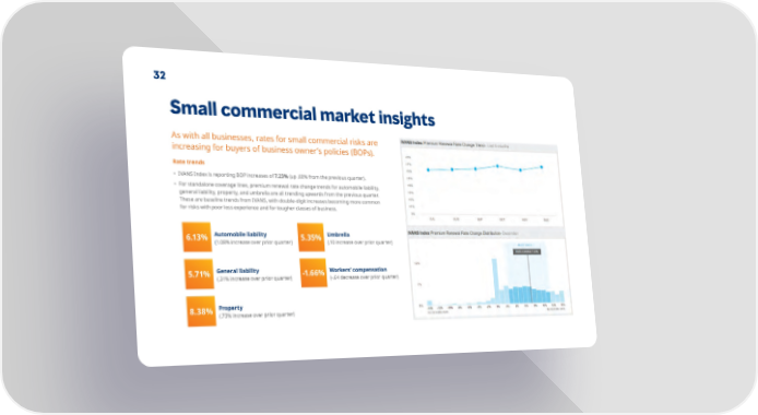 32 Small commercial market insights As with all businesses, rates for small commercial risks are increasing for buyers of business owner’s policies (BOPs). Rate trends • IVANS Index is reporting BOP increases of 7.23% (up .60% from the previous quarter). • For standalone coverage lines, premium renewal rate change trends for automobile liability, general liability, property, and umbrella are all trending upwards from the previous quarter. These are baseline trends from IVANS, with double-digit increases becoming more common for risks with poor loss experience and for tougher classes of business. 6.13% Automobile liability 5.35% Umbrella (1.08% increase over prior quarter) (.10 increase over prior quarter) 5.71% General liability -1.66% Workers’ compensation (.31% increase over prior quarter) (-.64 decrease over prior quarter) 8.38% Property (.73% increase over prior quarter)