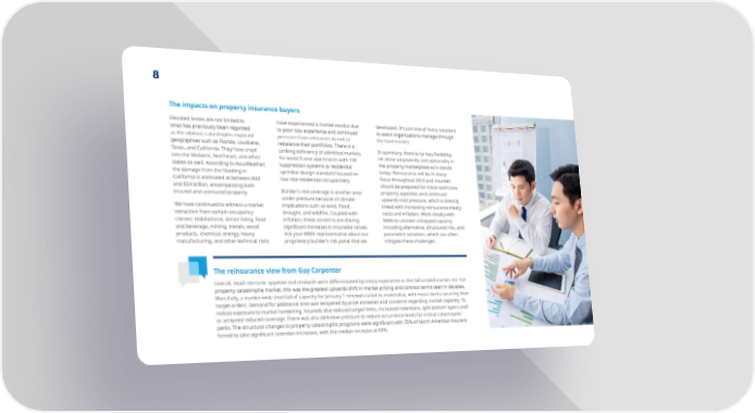 8 The impacts on property insurance buyers Elevated losses are not limited to have experienced a market exodus due developed. It’s just one of many solutions what has previously been regarded to poor loss experience and continued to assist organizations manage through as the obvious catastrophic-exposed pressure from reinsurers to exit or the hard market. geographies such as Florida, Louisiana, rebalance their portfolios. There is a In summary, there is far less 昀氀exibility, Texas, and California. They have crept striking de昀椀ciency of admitted markets let alone adaptability and optionality in into the Midwest, Northeast, and other for wood frame apartments with 13R the property marketplace as it stands states as well. According to AccuWeather, suppression systems (a residential today. Reinsurance will be in sharp the damage from the 昀氀ooding in sprinkler design standard focused on focus throughout 2023 and insureds California is estimated at between $30 low-rise residential occupancies). should be prepared for more restrictive and $34 billion, encompassing both Builder’s risk coverage is another area property appetites and continued insured and uninsured property. under pressure because of climate upwards cost pressure, which is directly We have continued to witness a market implications such as wind, 昀氀ood, linked with increasing reinsurance treaty costs and in昀氀ation. Work closely with retraction from certain occupancy drought, and wild昀椀re. Coupled with classes. Habitational, senior living, food in昀氀ation, these concerns are driving MMA to uncover untapped capacity and beverage, mining, metals, wood signi昀椀cant increases in insurable values. including alternative, structured risk, and products, chemical, energy, heavy Ask your MMA representative about our parametric solutions, which can often manufacturing, and other technical risks proprietary builder’s risk panel that we mitigate these challenges. The reinsurance view from Guy Carpenter Overall, tepid reinsurer appetite and renewals were di昀昀erentiated by treaty experience in this bifurcated market. For the property catastrophe market, this was the greatest upwards shift in market pricing and contract terms seen in decades. Mercifully, a market-wide shortfall of capacity for January 1 renewals failed to materialize, with most clients securing their target orders. Demand for additional limit was tempered by price increases and concerns regarding market capacity. To reduce exposure to market hardening, insureds also reduced target limits, increased retentions, split bottom layers and/ or accepted reduced coverage. There was also de昀椀nitive pressure to reduce occurrence limits for critical catastrophic perils. The structural changes to property catastrophic programs were signi昀椀cant with 70% of North American insurers forced to take signi昀椀cant retention increases, with the median increase at 60%.