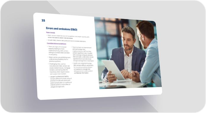 25 Errors and omissions (E&O) Rate trends • Rates remain stable because of competition and ample capacity, with some risks able to obtain rate decreases. • As with D&O, there is less pressure now to increase retentions. Considerations/conditions • There are signs of increased • There has been no improvement capacity leading to more with technology risks, stabilized pricing, with carriers cryptocurrency, or NFTs as they willing to combine D&O and E&O present signi昀椀cant risks. Coupled in one policy. with coverage ambiguity between • Major carriers are exhibiting more E&O and cyber, underwriters remain apprehensive to provide broad underwriting 昀氀exibility than in enough coverage that is meaningful. previous quarters. • Challenging risks, such as • Health care related technology E&O remains di昀케cult, particularly manufacturers E&O, certain real for insureds providing software estate-related classes, mortgage to hospitals to manage their brokers, and startup E&O for billing processes and/or protect franchises often require excess and surplus lines markets. con昀椀dential information. • Lawyers’ professional liability remains di昀케cult if certain areas of practice include wills and trusts, patent prosecution, or con昀氀icts of interest (which is most often an alleged wrongful act).