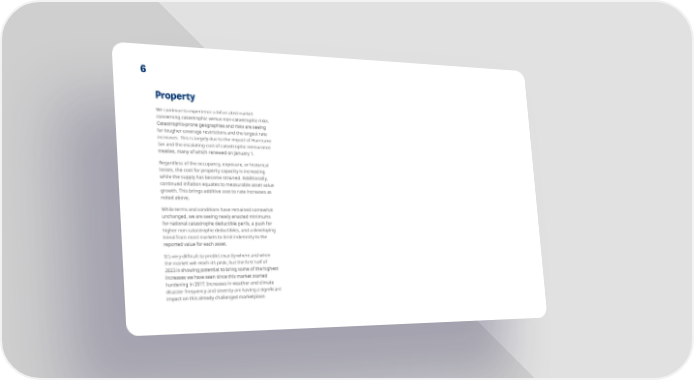 6 Property We continue to experience a bifurcated market concerning catastrophic versus non-catastrophic risks. Catastrophic-prone geographies and risks are seeing far tougher coverage restrictions and the largest rate increases. This is largely due to the impact of Hurricane Ian and the escalating cost of catastrophic reinsurance treaties, many of which renewed on January 1. Regardless of the occupancy, exposure, or historical losses, the cost for property capacity is increasing while the supply has become strained. Additionally, continued in昀氀ation equates to measurable asset value growth. This brings additive cost to rate increases as noted above. While terms and conditions have remained somewhat unchanged, we are seeing newly enacted minimums for national catastrophe deductible perils, a push for higher non-catastrophe deductibles, and a developing trend from most markets to limit indemnity to the reported value for each asset. It’s very di昀케cult to predict exactly where and when the market will reach its peak, but the 昀椀rst half of 2023 is showing potential to bring some of the highest increases we have seen since this market started hardening in 2017. Increases in weather and climate disaster frequency and severity are having a signi昀椀cant impact on this already challenged marketplace.