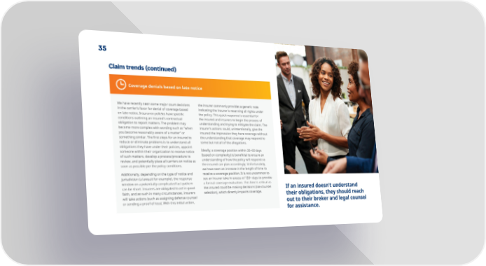 35 Claim trends (continued) Coverage denials based on late notice We have recently seen some major court decisions the insurer commonly provides a generic note in the carrier’s favor for denial of coverage based indicating the insurer is reserving all rights under on late notice. Insurance policies have speci昀椀c the policy. This quick response is essential for conditions outlining an insured’s contractual the insured and insurers to begin the process of obligation to report matters. The problem may understanding and trying to mitigate the claim. The become more complex with wording such as “when insurer’s actions could, unintentionally, give the you become reasonably aware of a matter” or insured the impression they have coverage without something similar. The 昀椀rst steps for an insured to the understanding that coverage may respond to reduce or eliminate problems is to understand all some but not all of the allegations. obligations they have under their policies, appoint Ideally, a coverage position within 30–60 days someone within their organization to receive notice of such matters, develop a process/procedure to (based on complexity) is bene昀椀cial to ensure an review, and potentially place all carriers on notice as understanding of how the policy will respond so soon as possible per the policy conditions. the insured can plan accordingly. Unfortunately, we have seen an increase in the length of time to Additionally, depending on the type of notice and receive a coverage position. It is not uncommon to jurisdiction (a lawsuit for example), the response see an insurer take in excess of 120+ days to provide window on a potentially complicated fact pattern a formal coverage evaluation. This time is critical as can be short. Insurers are obligated to act in good the insured could be making decisions (like counsel If an insured doesn’t understand faith, and as such in many circumstances, insurers selection), which directly impacts coverage. their obligations, they should reach will take actions (such as assigning defense counsel or sending a proof of loss). With this initial action, out to their broker and legal counsel for assistance.