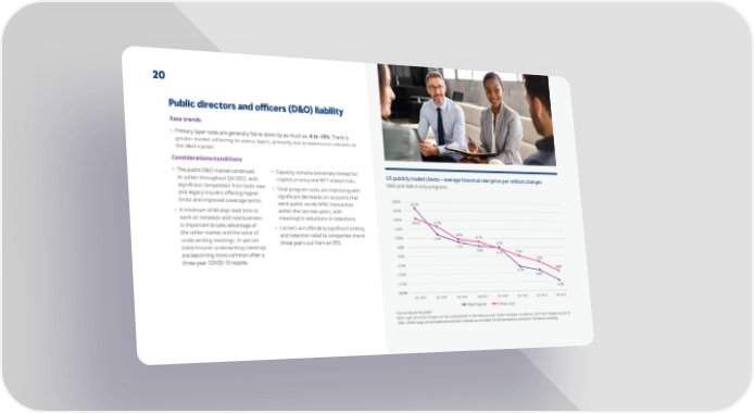 20 Public directors and o昀케cers (D&O) liability Rate trends • Primary layer rates are generally 昀氀at to down by as much as -8 to -10%. There is greater market softening on excess layers, primarily due to new insurer entrants to the D&O market. Considerations/conditions • The public D&O market continued • Capacity remains extremely limited for to soften throughout Q4 2022, with cryptocurrency and NFT related risks. US publicly traded clients – average historical rate (price per million) changes D&O and Side A-only programs signi昀椀cant competition from both new • Total program costs are improving with and legacy insurers o昀昀ering higher limits and improved coverage terms. signi昀椀cant decreases on accounts that 30.0% went public via de-SPAC transaction 26.3% • A minimum of 60 days lead time to within the last two years, with 25.0% work on renewals and new business meaningful reductions in retentions. 20.0% 20.6% 16.4% is important to take advantage of • Carriers are a昀昀ording signi昀椀cant pricing 15.0% the softer market and the value of and retention relief to companies one to 9.4% 8.1% underwriting meetings. In-person 10.0% 11.8% three years out from an IPO. 4.7% client/insurer underwriting meetings 5.0% 7.9% 5.5% are becoming more common after a 4.2% 0.0% 0.0% -3.3% three-year COVID-19 respite. -5.0% -8.8% -10.0% -6.2% -8.2% -15.0% -14.3% -20.0% Q1 2021 Q2 2021 Q3 2021 Q4 2021 Q1 2022 Q2 2022 Q3 2022 Q4 2022 Total Program Primary Layer Source: Marsh PlaceMAP Note: Layer structure changes are not contemplated in the total price per million analyses. In addition, 2019 rate changes outside of -50%–+250% range are excluded while all other renewals are included. Not all stacked bars will add to 100 due to rounding.
