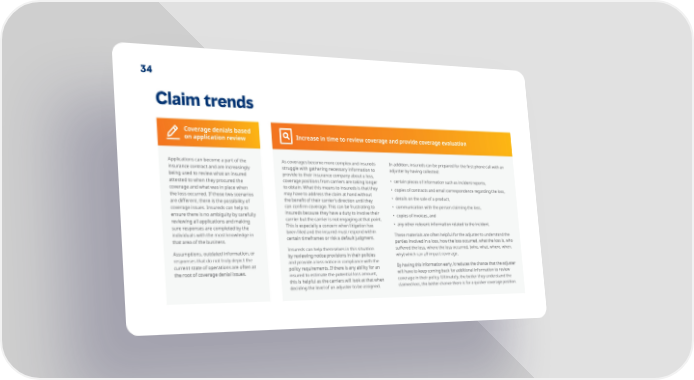 34 Claim trends Coverage denials based Increase in time to review coverage and provide coverage evaluation on application review Applications can become a part of the As coverages become more complex and insureds In addition, insureds can be prepared for the 昀椀rst phone call with an insurance contract and are increasingly struggle with gathering necessary information to adjuster by having collected: being used to review what an insured provide to their insurance company about a loss, attested to when they procured the coverage positions from carriers are taking longer • certain pieces of information such as incident reports, coverage and what was in place when to obtain. What this means to insureds is that they • copies of contracts and email correspondence regarding the loss, the loss occurred. If those two scenarios may have to address the claim at hand without • details on the sale of a product, the bene昀椀t of their carrier’s direction until they are di昀昀erent, there is the possibility of • communication with the person claiming the loss, coverage issues. Insureds can help to can con昀椀rm coverage. This can be frustrating to ensure there is no ambiguity by carefully insureds because they have a duty to involve their • copies of invoices, and reviewing all applications and making carrier but the carrier is not engaging at that point. sure responses are completed by the This is especially a concern when litigation has • any other relevant information related to the incident. individuals with the most knowledge in been 昀椀led and the insured must respond within These materials are often helpful for the adjuster to understand the that area of the business. certain timeframes or risk a default judgment. parties involved in a loss, how the loss occurred, what the loss is, who Assumptions, outdated information, or Insureds can help themselves in this situation su昀昀ered the loss, where the loss occurred, (who, what, where, when, responses that do not truly depict the by reviewing notice provisions in their policies why) which can all impact coverage. current state of operations are often at and provide a loss notice in compliance with the By having this information early, it reduces the chance that the adjuster the root of coverage denial issues. policy requirements. If there is any ability for an will have to keep coming back for additional information to review insured to estimate the potential loss amount, this is helpful as the carriers will look at that when coverage in their policy. Ultimately, the better they understand the deciding the level of an adjuster to be assigned. claimed loss, the better chance there is for a quicker coverage position.