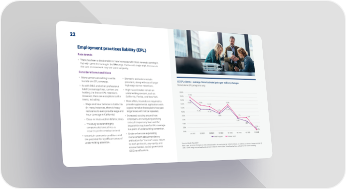 22 Employment practices liability (EPL) Rate trends • There has been a deceleration of rate increases with most renewals coming in 昀氀at with some increasing in the 5% range. Flat to mid-single-digit increases in the rate environment may see some longevity. Considerations/conditions • More carriers are willing to write • Biometric exclusions remain standalone EPL coverage. prevalent, along with use of larger US EPL clients – average historical rate (price per million) changes high wage earner retentions. Stand-alone EPL programs only • As with D&O and other professional liability coverage lines, carriers are • High-hazard states remain an 20.0% holding the line on EPL retentions. underwriting concern, such as 17.5% However, there are exceptions to this California, Florida, and New York. 18.0% trend, including: • More often, insureds are required to 16.0% 15.8% 13.5% 13.8% – Wage and hour defense in California provide supplemental applications with 14.0% 12.7% a good narrative that explains how past 12.0% (in many instances, there is heavy 12.7% resistance to even provide wage and large losses will not be repeated. 10.0% 11.3% 11.2% 9.7% hour coverage in California) • Increased scrutiny around how 8.0% 9.0% 7.1% – Class- or mass-action defense costs employers are navigating evolving 6.8% 6.0% 6.4% – The duty to defend highly salary transparency laws and the 4.0% 4.8% compensated executives as impact this may have for EPL coverage insurers prefer reimbursement is a point of underwriting contention. 2.0% 1.0% 0.0% 0.2% • Uncertain economic conditions and • Underwriters are expressing Q1 2021 Q2 2021 Q3 2021 Q4 2021 Q1 2022 Q2 2022 Q3 2022 Q4 2022 more concern about mandatory the potential for layo昀昀s are areas of arbitration for "me too" cases, return Total Program Primary Layer underwriting attention. to work protocols, pay equity, and Source: Marsh PlaceMAP environmental, social, governance Note: Layer structure changes are not contemplated in the total price per million analyses. In addition, 2019 rate changes outside of -50%–+250% range are excluded while all other renewals are included. Not all stacked bars will add to 100 due to rounding. (ESG) rami昀椀cations.