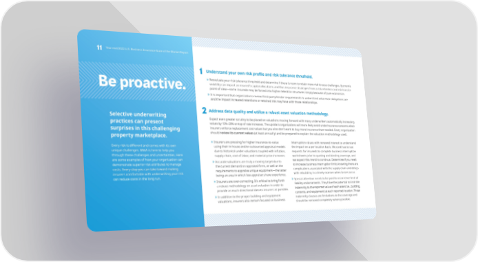 1111 Year-end 2022 U.S. Business Insurance State of the Market Report 1 Understand your own risk pro昀椀le and risk tolerance threshold. »Reevaluate your risk tolerance threshold and determine if there is room to retain more risk to ease challenges. Economic volatility can impact an insured’s capital allocations and thus insurance strategies from a risk retention and risk transfer Be proactive. point of view—some insureds may be forced into higher retention structures simply because of pure economics. »It is important that organizations review third-party/lender requirements to understand what their obligations are and the impact increased retentions or retained risk may have with those relationships. Selective underwriting 2 Address data quality and utilize a robust asset valuation methodology. practices can present Expect even greater scrutiny to be placed on valuations moving forward with many underwriters automatically increasing values by 15%–20% on top of rate increases. The upside is organizations will more likely avoid underinsurance concerns when surprises in this challenging insurers enforce replacement cost values but you also don’t want to buy more insurance than needed. Every organization property marketplace. should review its current values (at least annually) and be prepared to explain the valuation methodology used. »Insurers are pressing for higher insurance-to-value interruption values with renewed interest to understand Every risk is di昀昀erent and comes with its own using their in-house and/or outsourced appraisal models the impact on a per location basis. We continue to see unique challenges. MMA is here to help you due to historical under valuations coupled with in昀氀ation, requests for insureds to complete business interruption through these challenges and uncertainties. Here supply chain, cost of labor, and material price increases. worksheets prior to quoting and binding coverage, and are some examples of how your organization can »Accurate valuations are truly a moving target due to we expect this trend to continue. Determine if you need demonstrate superior risk attributes to manage to increase business interruption limits knowing there are costs. Every step you can take toward making the current demand on appraisal 昀椀rms, as well as the complications associated with the supply chain and delays insurers comfortable with underwriting your risk requirements to appraise unique equipment—the latter with rebuilding in a timely manner when losses occur. can reduce costs in the long run. being an area in which few appraisers have experience. »Special attention needs to be paid to occurrence limit of »Insurers are over-correcting. It’s critical to bring forth liability endorsements. They have the potential to limit the a robust methodology on asset valuation in order to provide as much directional data to insurers as possible. indemnity to the reported value of each asset (i.e., building, »In addition to the proper building and equipment contents, and equipment) at each reported location. These valuations, insurers also remain focused on business indemnity clauses are limitations to the coverage and should be removed completely where possible.
